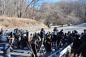 1月15日朝、事故の現場検証の様子を見守る報道陣。上空には多くのヘリコプターが飛びかっていた。