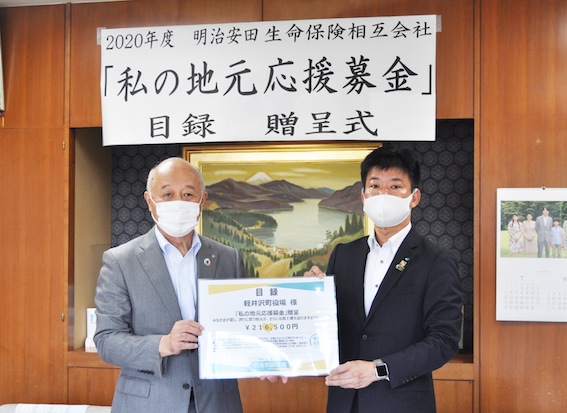 明治安田生命保険相互会社は8月4日、軽井沢町に21万6500円を寄付した。同社長野支社長の竹林浩昭さんが、藤巻町長に目録を手渡した。寄付金は「私の地元応援基金」という名のもと、明治安田生命グループの全従業員(約4万7千人)が、出身地などゆかりのある地元の自治体、団体などに募金し、会社からの寄付を上乗せしたもの。竹林さんは「地域社会全体が再び元気を取り戻すことを願い、一層の支援を継続していく」と話した。寄付金は、公共施設で使用するアルコール消毒液の購入費などにあてる予定だ。