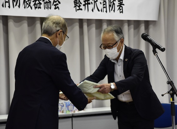 新軽地区、寄贈された消防機器を区民に配布