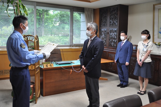 軽井沢警察署は7月7日、特殊詐欺被害を未然に防止したとして、佐久浅間農協軽井沢支所に感謝状を贈った。6月30日、北佐久郡内の80代女性が来所し、「今日、孫に車の代金600万円を渡さないといけない」と話したため、対応にあたった従業員が特殊詐欺を疑い、親族への事実確認を促した。女性は一旦帰宅したあと、身内に確認をとって詐欺だと判明した。支所長の行田公安さんは「利用者の財産を守るため、観察や声掛けをこれからも心掛けたい」と話した。