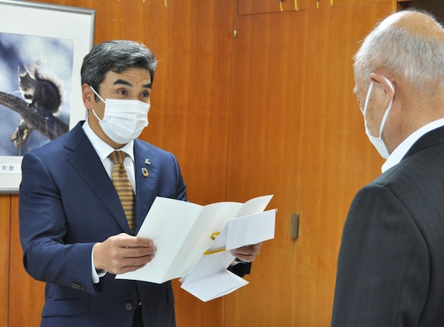 千曲運輸(小諸市)は10月1日、長野銀行の「ながぎん地域応援私募債」を活用し、町内の義務教育学校4校に20万円を寄付した。寄付金は各校から要望を聞き、新型コロナ対策の備品購入などに役立てる。「ながぎん地域応援私募債」は地域貢献を目的に、私募債の発行手数料の一部を自治体や病院などに寄付するもの。同社は、他の銀行の私募債も活用し、軽井沢病院や小諸市、佐久市の病院にも、コロナ対策の備品を寄贈している。中嶋剛登社長は「学校でも消毒液の準備などが大変と聞いた。少しでも子どもたちのためになれば」と話した。
