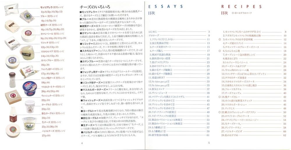 1.モッツァレラと生ハムのサラダ仕立て/2.アボカドとモッツァレラの和風和え物/3.モッツァレラのおやき信州風/4.チーズ屋のリゾットー/5.チキンソテーのブルーチーズソース/6.ちゃんちゃん焼/7.オーブンシート包み簡単レシピ/8.焼きおにぎり/9.トルティーヤとパニーニ/10.チーズソース&サラダ/11.牛ヒレ肉のロッシーニ風/12.リコッタチーズとほうれん草のスパゲッティー/13 タラモのチーズ春巻き/14.スカモルツァのチーズステーキ/15.白身魚とスカモルツァの蒸し焼き/16.フルーツカクテルー/17.チーズフォンデュ/18.焼チーズカレー/19.オイル漬け&野菜スティック/20.マスカルポーネ・シュー/21.ティラミス/22.帆立のウォッシュチーズグラタン/23.ホワイトヨーグルトケーキー/24.イチゴとブルーベリーのスムー/25.生チーズケーキー/26.タンドリーチキン/27.バジルチーズピザ/28.私のおすすめ