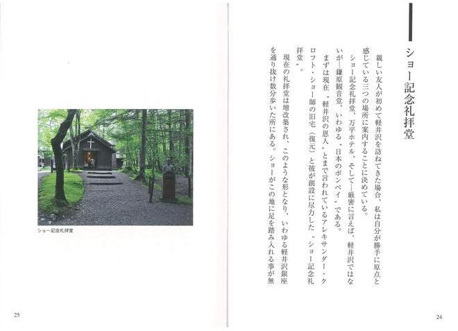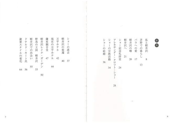 私と軽井沢/茅野での暮らし/バラへの愛/軽井沢の噂/軽井沢へ/ショー記念礼拝堂/アレキサンダー・クロフト・ショー/ショーの宣教活動/ショーの結婚/ショーの逝去/軽井沢の変遷/万平ホテル/現在の万平ホテル/鎌原観音堂/軽井沢レイク・ガーデン/野鳥の王国 軽井沢/軽井沢での出会い/ドナルド・キーン氏/避暑スタイルの変化