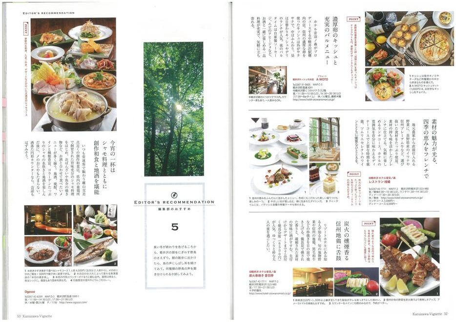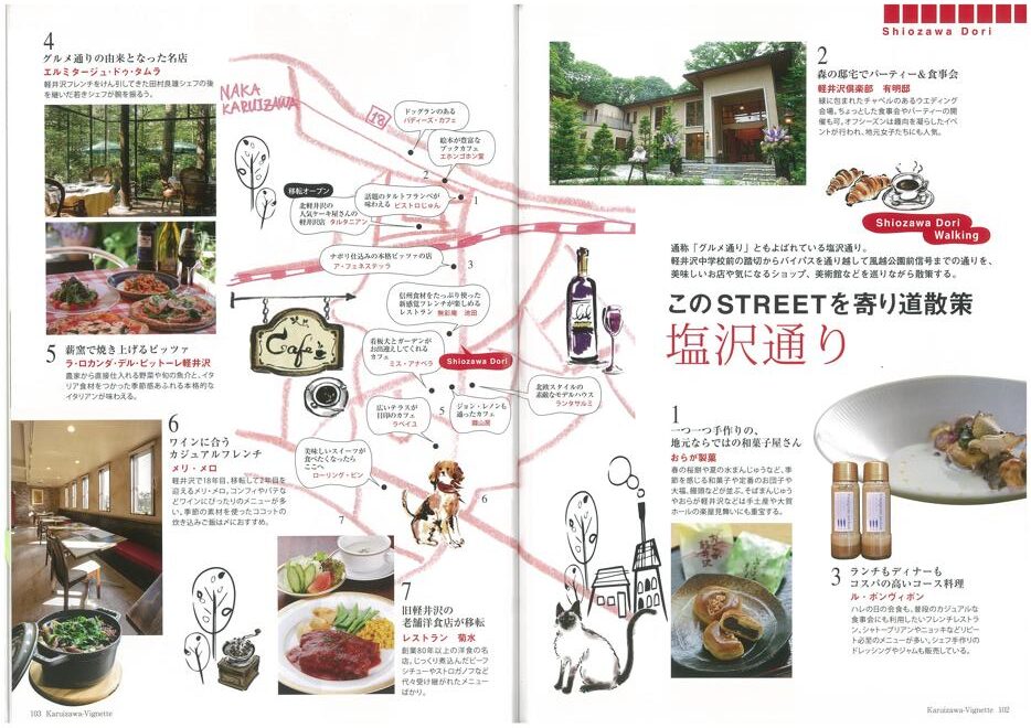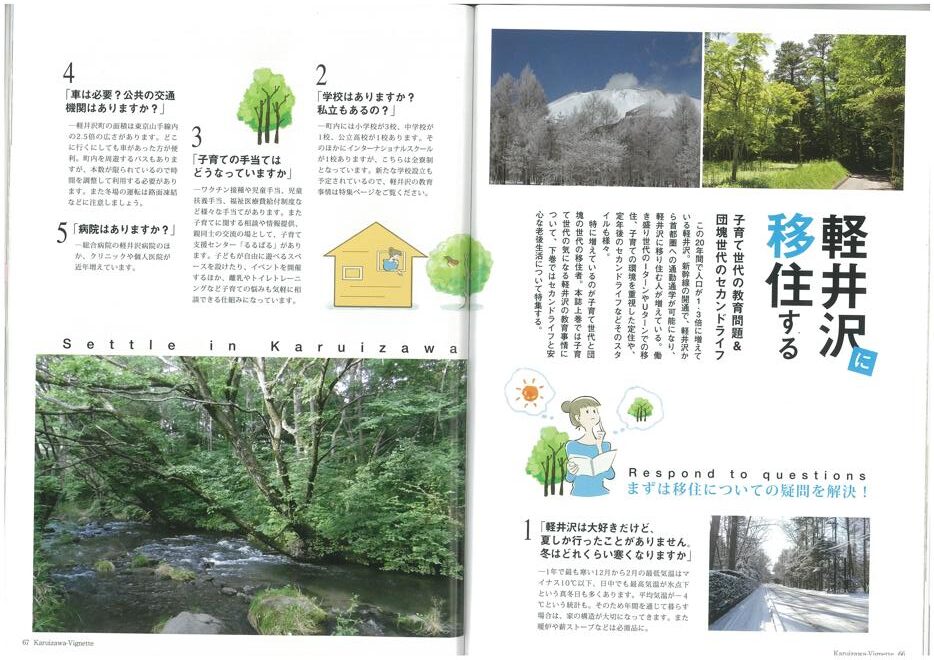 vignette(ヴィネット)は英語で「言葉で描写する」「場面をとらえる」などの意味があります。軽井沢の自然、文化、歴史、別荘ライフの様々なシーンをヴィネットしています。ページをめくると、高原の爽やかな緑の風が薫るような、そんな”高原誌”です。著名人の別荘にお邪魔する「別荘訪問」や「別荘の食卓」など軽井沢の別荘ライフをテーマに軽井沢の衣食住を様々な切り口で紹介しています。