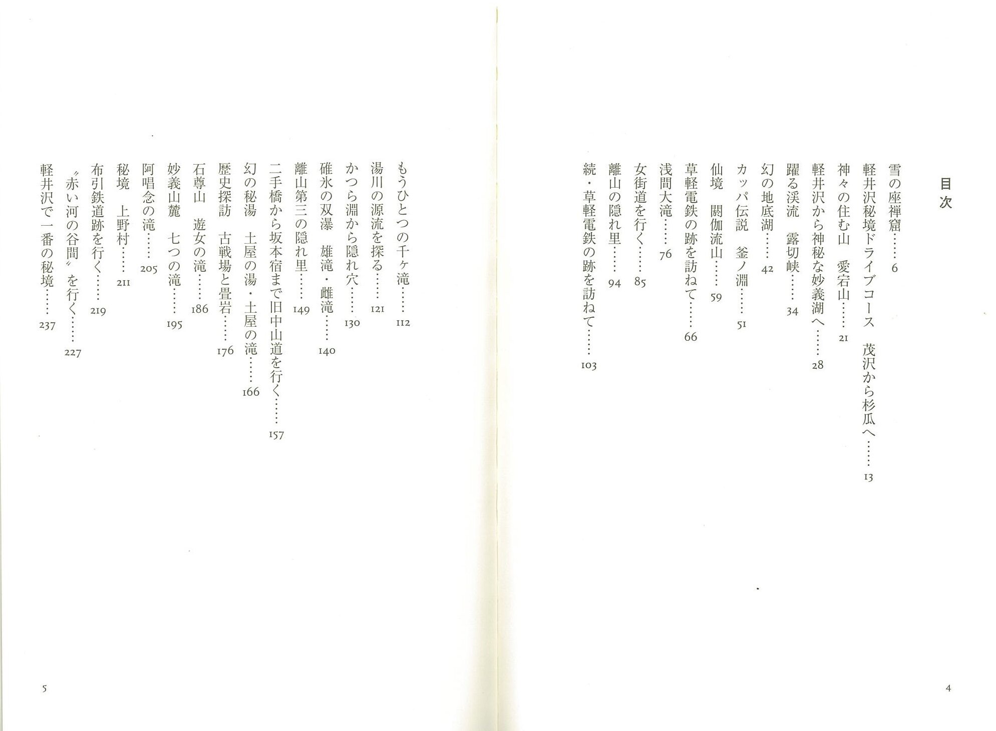雪の座禅窟/軽井沢秘境ドライプコース 茂沢から杉瓜へ/神々の住む山 愛宕山/軽井沢から神秘な妙義湖へ/躍る渓流 露切峡/幻の地底湖/カッパ伝説 釜ノ淵/仙境 閑伽流山/草軽電鉄の跡を訪ねて/浅間大滝/女街道を行く/離山の隠れ里/続・草軽電鉄の跡を訪ねて/もうひとつの千ヶ滝/湯川の源流を探る/かつら淵から隠れ穴/碓氷の双瀑 雄滝・雌滝/離山第三の隠れ里/二手橋から坂本宿まで旧中山道を行く/幻の秘湯 土屋の湯・土屋の滝/歴史探訪 古戦場と畳岩/石尊山 遊女の滝/妙義山麓 七つの滝/阿唱念の滝/秘境 上野村/布引鉄道跡を行く/“赤い河の谷間”を行く/軽井沢で一番の秘境