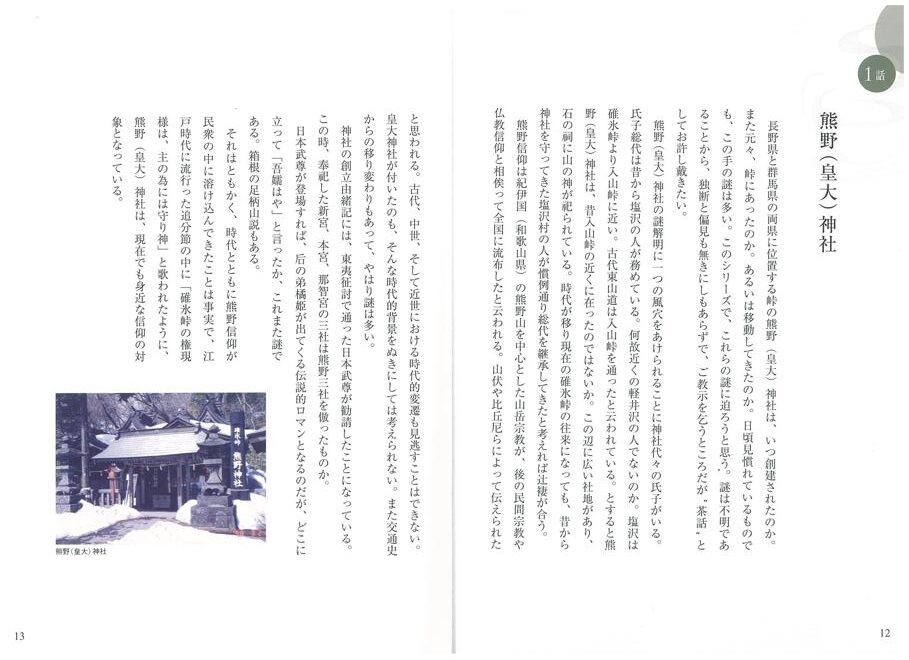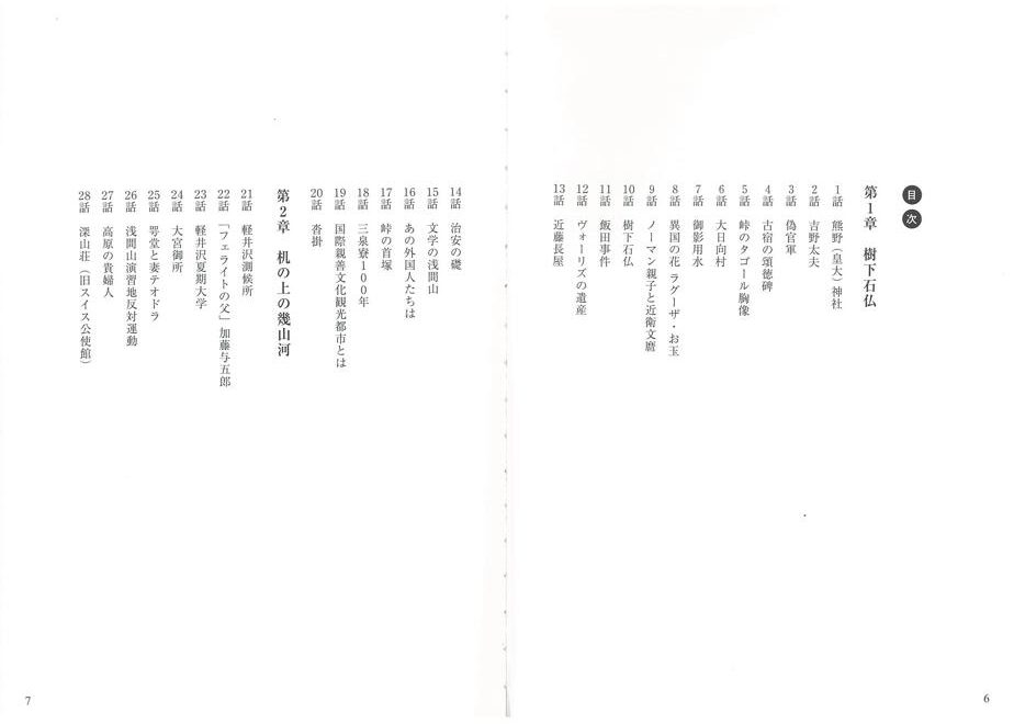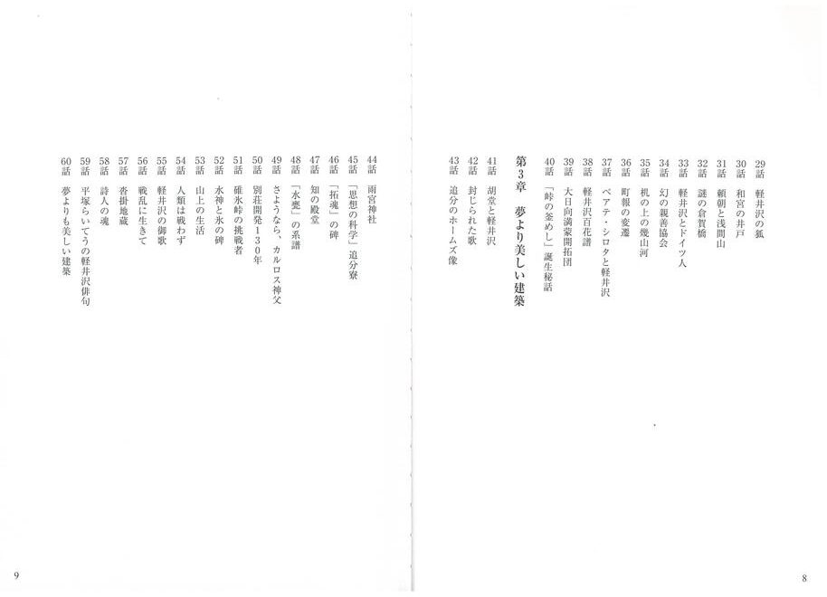 1話 熊野 (皇大) 神社/2話 吉野太夫/3話 偽官軍/4話 古宿の頌徳碑/5話 峠のタゴール胸像/6話 大日向村/7話 御影用水/8話 異国の花 ラグーザ・お玉/9話 ノーマン親子と近衛文麿/10話 樹下石仏/11話 飯田事件/12話 ヴォーリズの遺産/13話 近藤長屋/14話 治安の礎/15話 文学の浅間山/16話 あの外国人たちは/17話 峠の首塚/18話 三泉寮100年/19話 国際親善文化観光都市とは/20話 沓掛/第2章 机の上の幾山河/21話 軽井沢測候所/22話 「フェライトの父」加藤与五郎/23話 軽井沢夏期大学/24話 大宮御所/25話 萼堂と妻テオドラ/26話 浅間山演習地反对運動/27話 高原の貴婦人/28話 深山荘(旧スイス公使館)/29話 軽井沢の狐/30話 和宮の井戸/31話 頼朝と浅間山/32話 謎の倉賀橋/33話 軽井沢とドイツ人/34話 幻の親善協会/35話 机の上の幾山河/36話 町報の変遷/37話 ベアテ・シロタと軽井沢/38話 軽井沢百花譜/39話 大日向満州開拓团/40話 「峠の釜めし」誕生秘話/第3章 夢より美しい建築/41話 胡堂と軽井沢/42話 封じられた歌/43話 追分のホームズ像/44話 雨宮神社/45話 「思想の科学」追分寮/46話 「拓魂」の碑/47話 知の殿堂/48話 「水甕」の系譜/49話 さようなら、カルロス神父/50話 別荘開発130年/51話 碓氷峠の挑戦者/52話 水神と氷の碑/53話 山上の生活/54話 人類は戦わず/55話 軽井沢の御歌/56話 戦乱に生きて/57話 沓掛地蔵/58話 詩人の魂/59話 平塚らいてうの軽井沢俳句/60話 夢よりも美しい建築