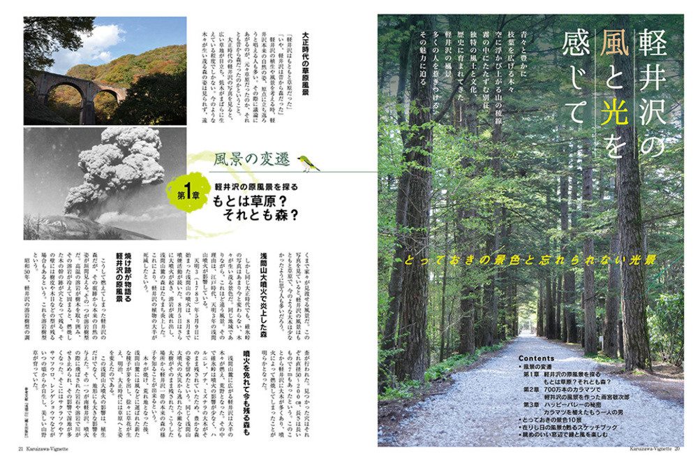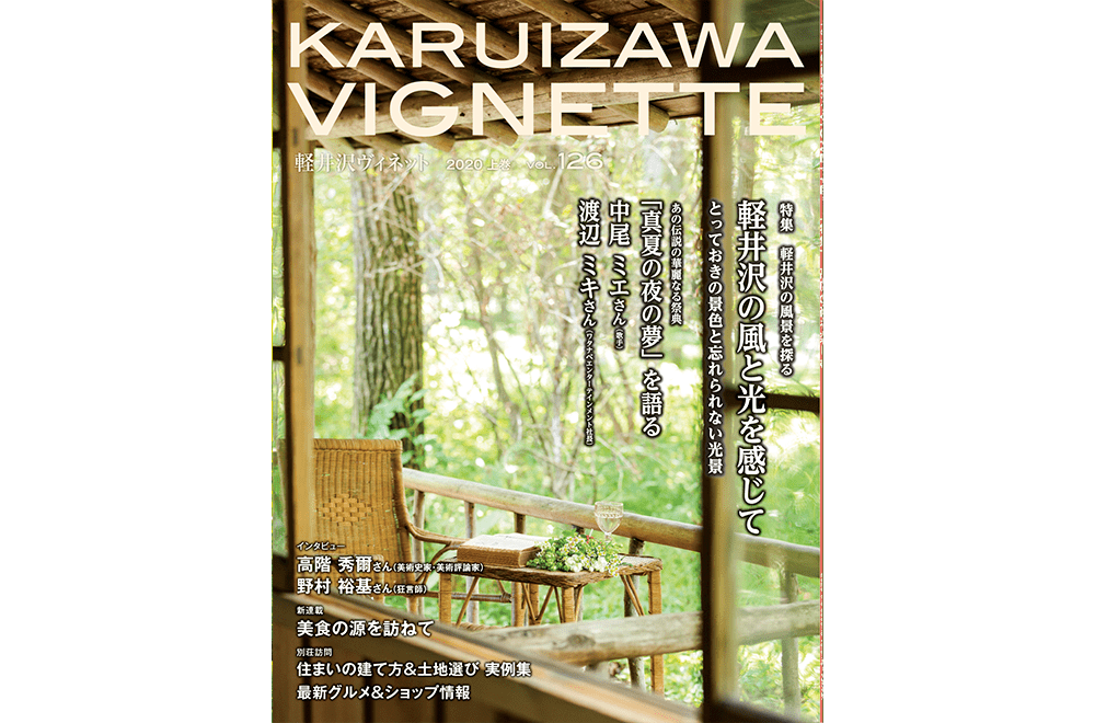 vignette(ヴィネット)は英語で「言葉で描写する」「場面をとらえる」などの意味があります。軽井沢の自然、文化、歴史、別荘ライフの様々なシーンをヴィネットしています。ページをめくると、高原の爽やかな緑の風が薫るような、そんな”高原誌”です。著名人の別荘にお邪魔する「別荘訪問」や「別荘の食卓」など軽井沢の別荘ライフをテーマに軽井沢の衣食住を様々な切り口で紹介しています。