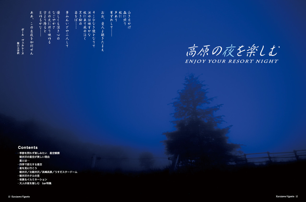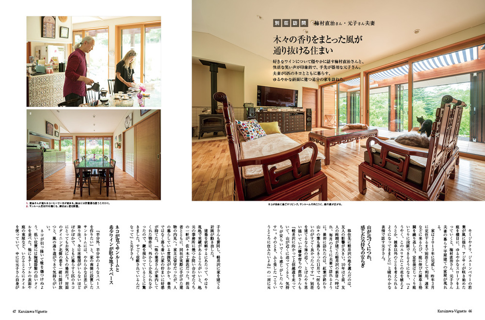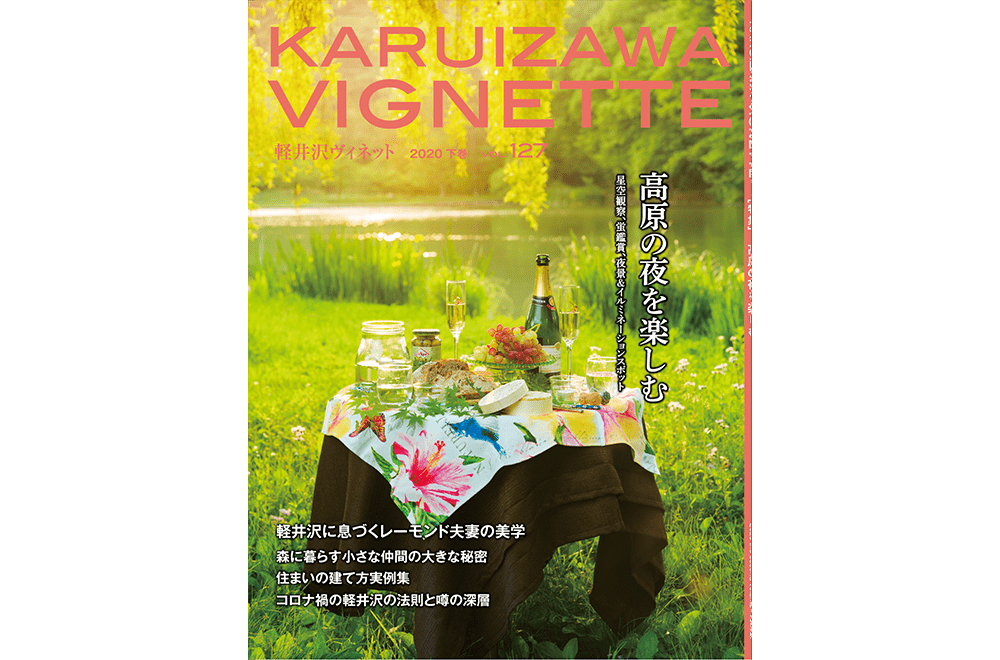 vignette(ヴィネット)は英語で「言葉で描写する」「場面をとらえる」などの意味があります。軽井沢の自然、文化、歴史、別荘ライフの様々なシーンをヴィネットしています。ページをめくると、高原の爽やかな緑の風が薫るような、そんな”高原誌”です。著名人の別荘にお邪魔する「別荘訪問」や「別荘の食卓」など軽井沢の別荘ライフをテーマに軽井沢の衣食住を様々な切り口で紹介しています。