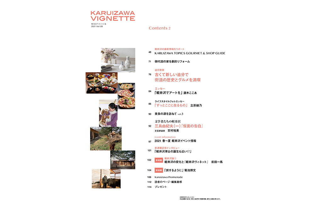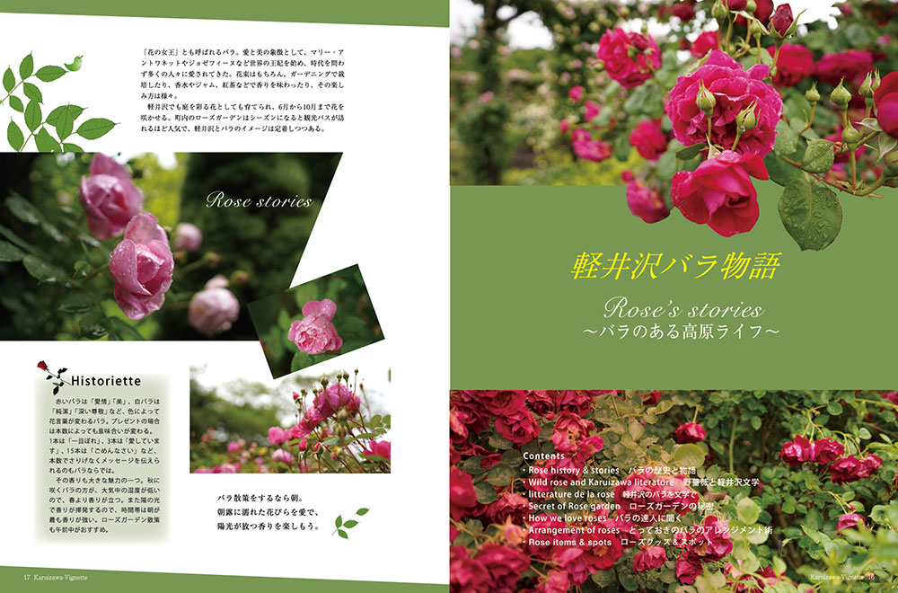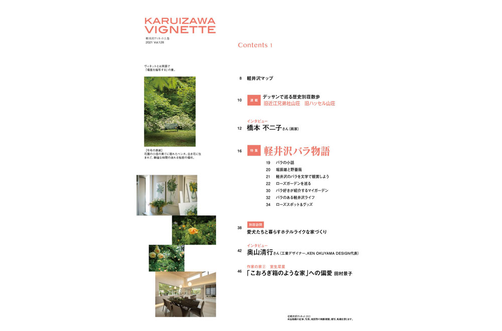 vignette(ヴィネット)は英語で「言葉で描写する」「場面をとらえる」などの意味があります。軽井沢の自然、文化、歴史、別荘ライフの様々なシーンをヴィネットしています。ページをめくると、高原の爽やかな緑の風が薫るような、そんな”高原誌”です。著名人の別荘にお邪魔する「別荘訪問」や「別荘の食卓」など軽井沢の別荘ライフをテーマに軽井沢の衣食住を様々な切り口で紹介しています。