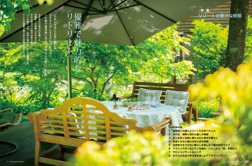 vignette(ヴィネット)は英語で「言葉で描写する」「場面をとらえる」などの意味があります。軽井沢の自然、文化、歴史、別荘ライフの様々なシーンをヴィネットしています。ページをめくると、高原の爽やかな緑の風が薫るような、そんな”高原誌”です。著名人の別荘にお邪魔する「別荘訪問」や「別荘の食卓」など軽井沢の別荘ライフをテーマに軽井沢の衣食住を様々な切り口で紹介しています。